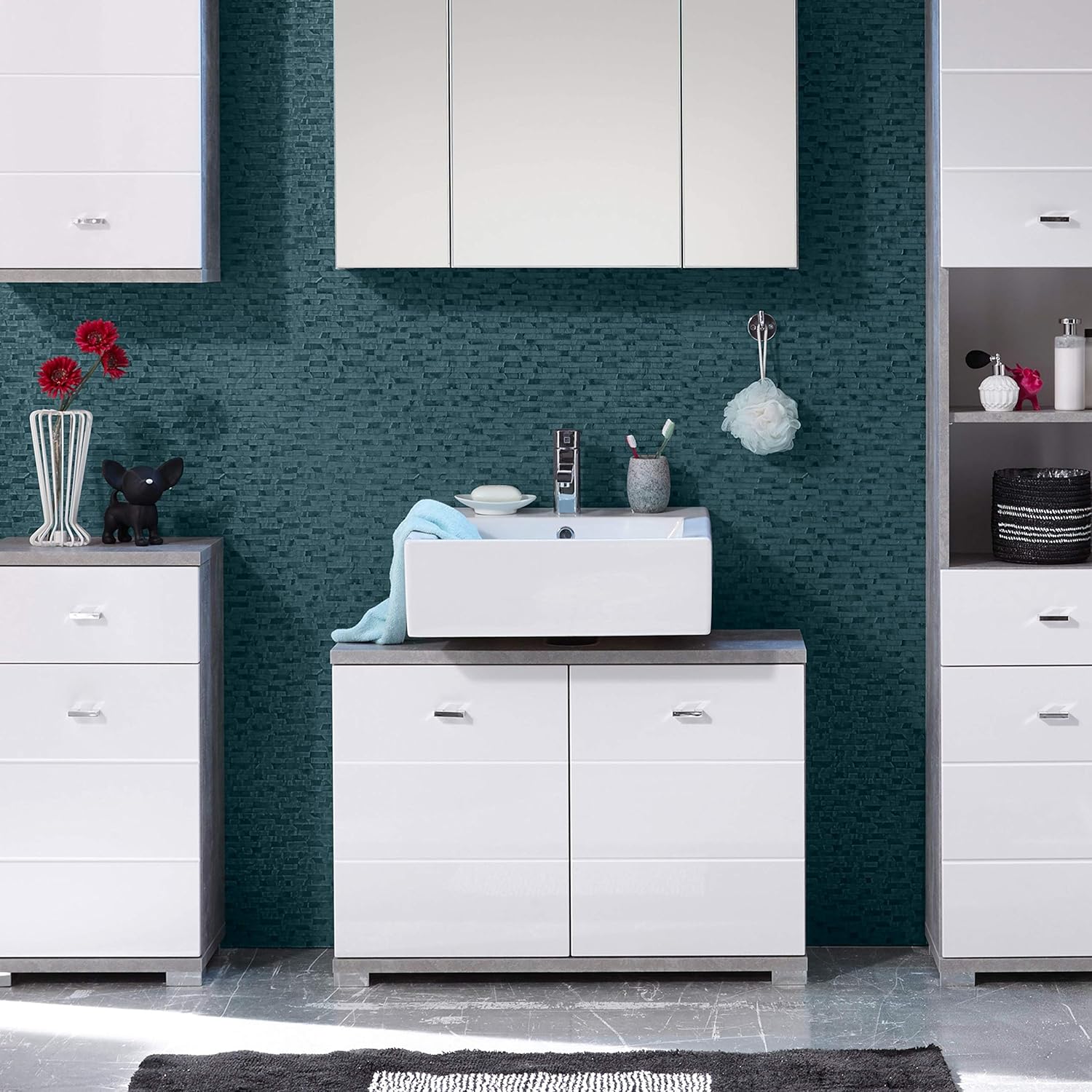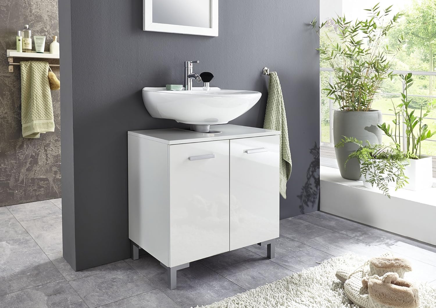 Trendteam Smart Living Badezimmer Waschbeckenunterschrank Unterschrank Skin 60 X 57 X 31 Cm In Front Weiss Hochglanz Korpus Sardegna Rauchsilber Mit Viel Stauraum Amazon De Kuche Haushalt Wohnen